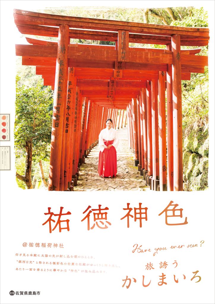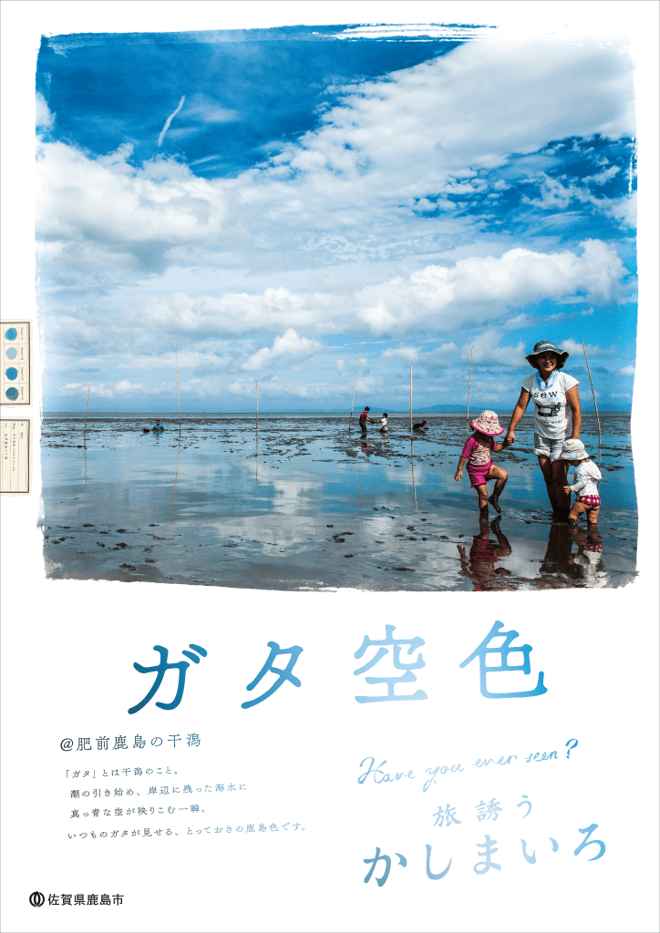 ディスティネーション(旅の目的地)として鹿島の認知度向上を目的にポスター制作をご依頼いただきました。調査する中で、鹿島市の観光資源には日本を代表するオンリーワンのものが多数あることがわかりました。日本一の干満差を有しかつ有明海でも数少ない泥干潟である「ガタ」、日本三大稲荷にも数えられ、九州で2番目に参拝客が多い「祐徳稲荷」、世界ワインコンクールで金賞をとった鍋島を筆頭とした「酒と酒蔵」など、 いずれも見る価値、訪れる価値があるものばかり。「鹿島色 かしまいろ kashima colors」をキーコンセプトに、鹿島に数あるオンリーワンな観光資源それぞれの価値を創造した「色」に込め、広告表現していくことを提案。制作の中で地元・鹿島実業高校ではワークショップは実際のポスター制作なども行いました。日本観光ポスターコンクールで優秀賞を受賞。